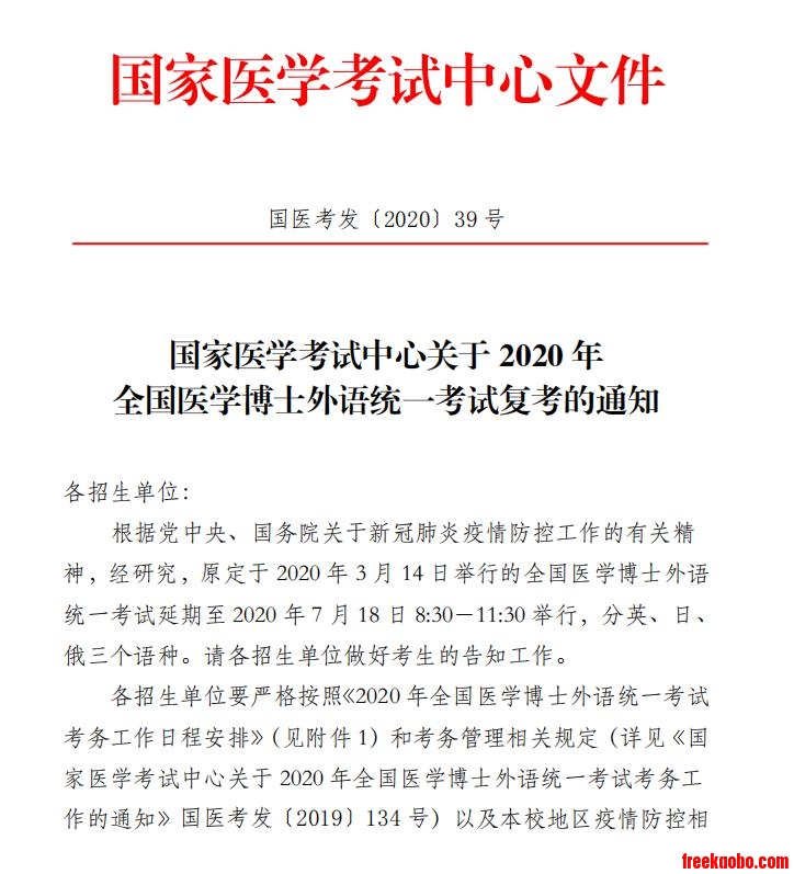 主题 : 2020年全国医学博士外语统一考试时间:7月18日
