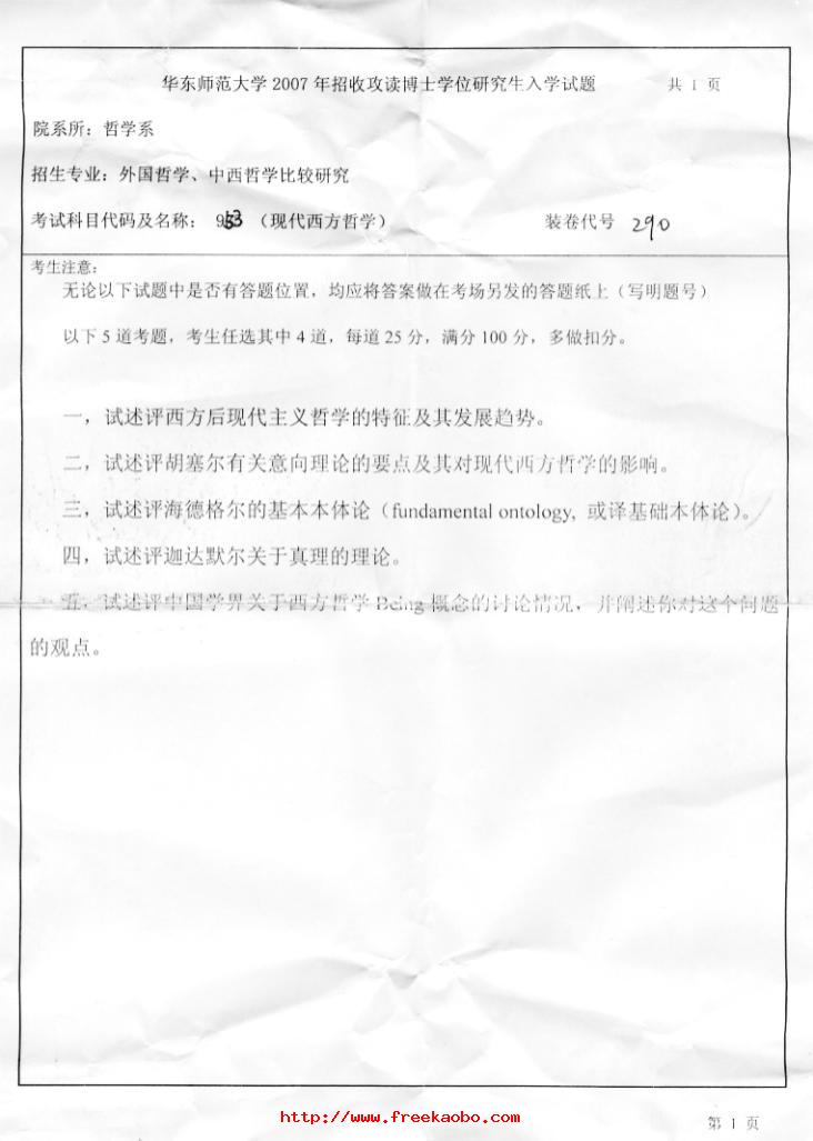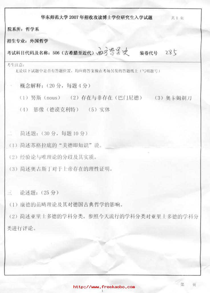 主题 : 华东师范大学2007西方哲学史和现代西方哲学考博试题